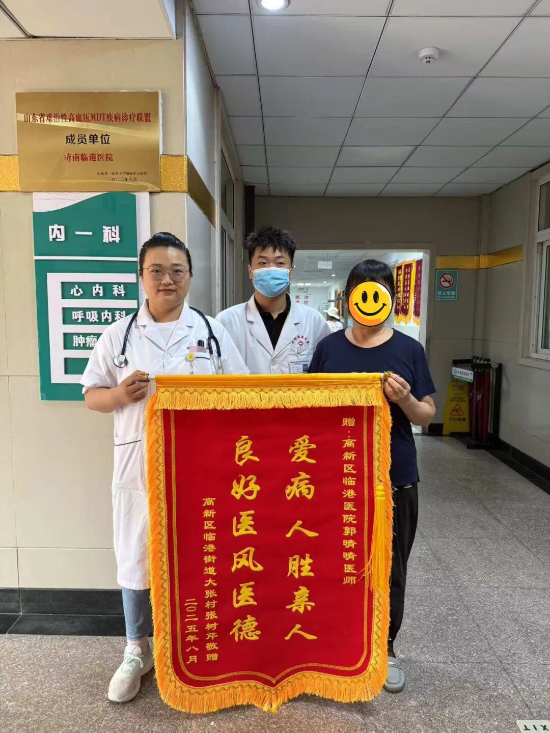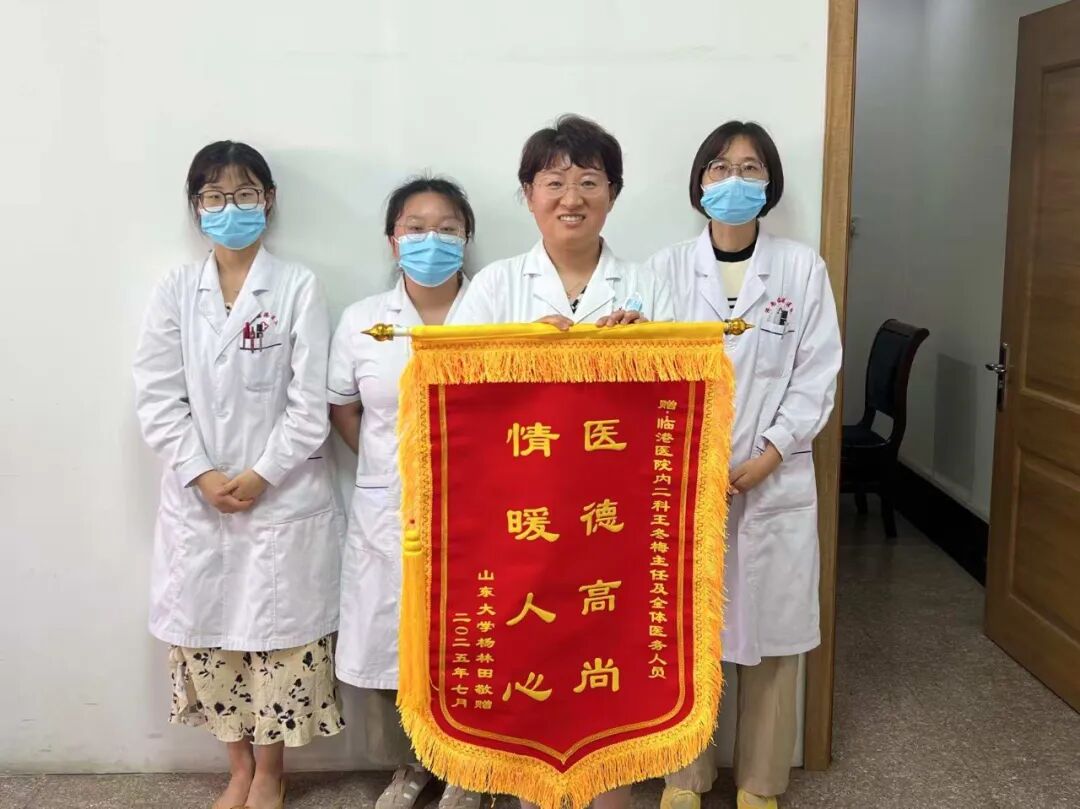 患者张老师,因腹痛给内一科郭晴晴医生打电话咨询,郭大夫了解到患者的实际情况后,建议患者立即来院检查。检查后考虑为嵌顿疝,需要转到普外科做进一步检查治疗,因患者自己来院时无家属陪伴,郭晴晴医生以患者首诊医师的身份,主动帮忙患者联系普外科大夫并将患者送到普外科病房,因为郭大夫准确、及时的诊断,患者于入院当天进行手术,术后恢复良好。患者及家属为表达对郭晴晴医生的感谢,特送来锦旗。
