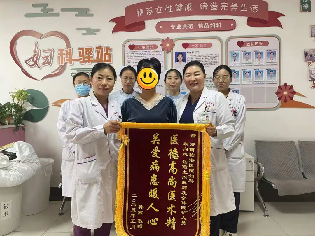 患者韩女士,因子宫肌瘤,宫颈息肉入院,入院后行腹腔镜下子宫肌瘤挖出术+宫腔镜下宫颈息肉电切术,术后患者恢复良好,患者与家属对我院妇科的治疗服务满意,特送锦旗一枚,表示感谢。